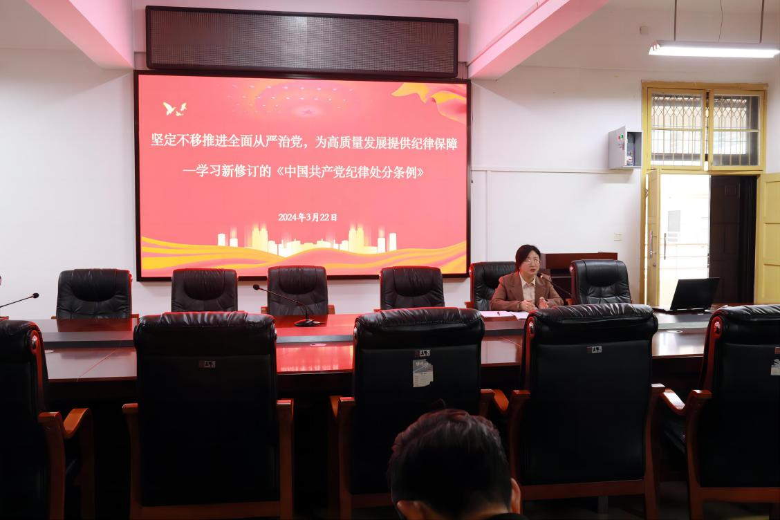 随后,公司党总支书记何志红与全体党员干部一同学习研讨了新修订的《中国共产党纪律处分条例》(简称《条例》)。何志红同志从“条例为何再次修订、此次修订有哪些突出特点、将对推动全面从严治党向纵深发展起到什么作用”等三个方面对《条例》进行解读,并指出新修《条例》传递了三点信息:一、聚焦重点、难点问题,坚决纠治形式主义、官僚主义;二、严守思想防线,以严明的纪律推进党的自我革命;三、坚持以严的基调全面加强党的纪律建设。