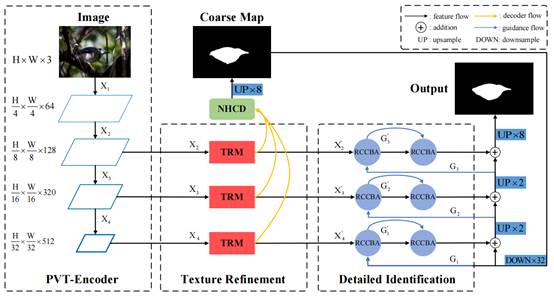 该论文在公司焦铬教授的指导下完成,mksport体育为唯一署名单位。论文的核心理论是:伪装物体检测作为一种新兴的计算机视觉任务,与传统的物体检测不同的是,伪装物体与其周围环境的纹理是极其相似的,且在大小和形状上也有很大的不同,这使得伪装物体的检测变得极具挑战性。因此,本论文提出了一种增强识别网络,用以增强伪装物体的检测能力。EINet主要由三个部分组成,首先,论文使用了PVT作为编码器,目的是在能够更好地学习到伪装物体检测任务的高分辨率表达前提下,提取出更加强健和更具鲁棒性的特征;然后,为了使得网络的学习能够朝着正确识别伪装物体的方向前进,论文提出了TRM模块用以获取细粒度特征,并且提出了NHCD解码器用以生成精确识别伪装物体的引导先验;最后,在引导先验的指导下,论文还设计了一个全新的RCCBA模块用以识别多尺度的细粒度特征,从而对伪装物体的识别能力进行增强。论文还经过大量地消融实验证明,EINet对于伪装物体的识别能力远远领先于现有的伪装物体检测模型,达到了目前的SOTA性能。