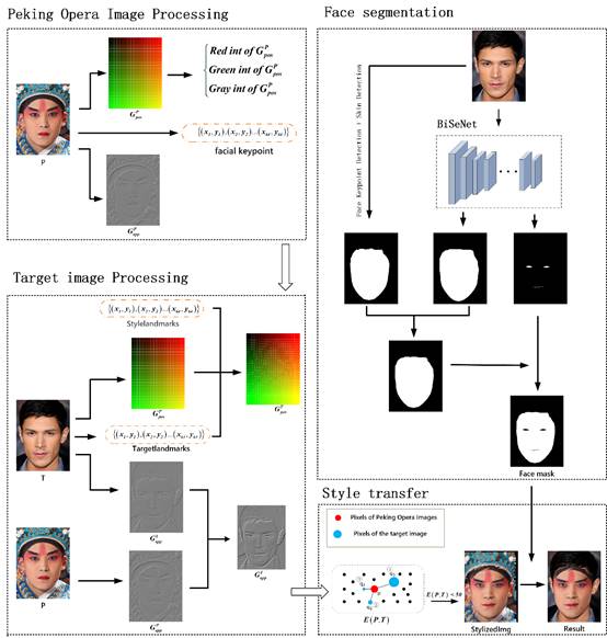 该论文是在公司梁小满教授的指导下完成,MK体育、智能信息处理与应用湖南省重点实验室为署名单位。论文核心理论是:当使用标准的神经网络迁移方法进行人像风格迁移时,往往不能保证语义上的正确转移;风格实例中的纹理细节往往被忽略。本文提出了一种名为POFMakeup的京剧脸谱风格转移方法,方法的技术路线如图1所示。这种方法可以将带有京剧脸谱的人像的风格转移到另一个人像上。该方法使用两个指南,位置指南和外观指南。位置指南保证了转移过程中语义的一致性,而外观指南则保证了转移过程中目标对象的外观能够被保留下来。实验结果表明,该方法不仅解决了传统人像风格转换的问题,而且能够快速、完美地实现京剧脸谱的风格转换。提出的方法在结构相似度(SSIM)方面比传统方法提高了17%。