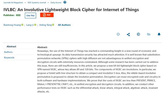 近日,MK体育2021级电子信息专业研究生黄现彤以第一作者在SCI二区期刊IEEE systems journal(2021年影响因子:4.802)发表研究论文,论文题目为《IVLBC: An Involutive Lightweight Block Cipher for Internet of Things》。