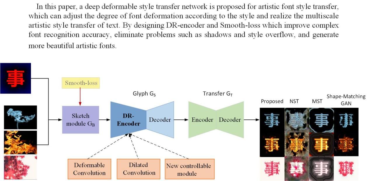 该论文是在公司林睦纲副教授的指导下完成,mksport体育为唯一署名单位。论文核心理论是:字体样式转移的本质是在保持字体字形结构的同时,将图像的样式特征转移到字体中。目前,基于卷积神经网络的生成对抗网络在字体样式生成中发挥着重要作用。然而,传统的卷积神经网络识别字体图像存在对未知图像变化适应性差、泛化能力弱、纹理特征提取能力差等问题。当字形结构非常复杂时,复杂字体图像无法有效识别。本文提出了一种用于艺术字体风格转移的深度可变形风格迁移网络,该网络可以根据风格调整字体的变形程度,实现文本的多尺度艺术风格转移。该模型包括用于学习字形映射的草图模块、用于学习风格特征的字形模块和用于融合风格纹理的迁移模块。在字形模块中,设计了Deform-Resblock编码器来提取字形特征,其中引入了可变形卷积,改变残差模块的大小,实现了不同尺度特征信息的融合,更好地保留了字体结构,增强了文本变形的可控性。因此,我们的网络对文字的控制能力更强,对图像特征信息的处理能力更强,能够产生更加精美的艺术字体。