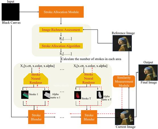 该论文是在公司梁小满教授的指导下完成,mksport体育为第一署名单位。论文核心理论是:在传统的基于笔触的图像转绘画技术中,笔触经常在已绘制的区域中重复出现,导致渲染效果不佳、笔触利用率低以及图像质量低下。在论文中,作者提出了一种基于目标图像不同区域的固有特征动态分配笔触的方法。所提出的方法利用估算技术确定不同图像区域中的信息量,以生成内容丰富度的序列。然后,根据内容丰富度的序列动态分配笔触数量,从而得到一系列笔触。随后,根据它们的序列灵活调整笔触在画布上的分布,以实现对目标图像的精确渲染。此外,优化和改进了原始网络模型,使笔触渲染更加精确,从而获得更符合输入图像的最终结果。实验结果表明,所提出的方法可以根据不同图像区域之间的固有差异科学地分配笔触,从而实现有效的渲染、提高笔触利用率和更高的视觉性能。此外,诸如峰值信噪比、结构相似性和学习的感知图像块相似性等许多指标与传统技术相比表现出更高的图像质量。图1给出了方法的技术路线。