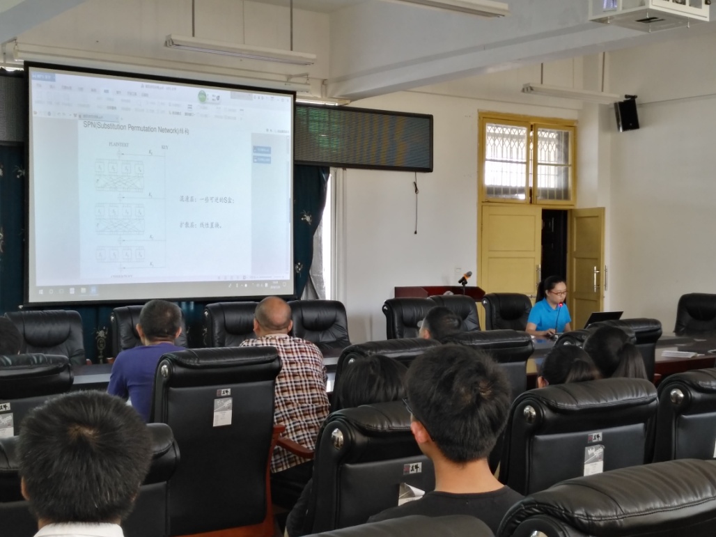 李秋萍博士从介绍分组密码中扩散层出发,对MDS矩阵的相关理论做了详细的介绍,并针对递归MDS矩阵与对合MDS的构造等问题进行了深入地探讨。李博士的报告向我们展示了学术研究的方法与理论。会上,李秋萍博士还与在场师生就MDS矩阵如何判别,对合MDS矩阵是否可以引入递归的思想,MDS矩阵的实际应用等相关内容进行了深入的交流与探讨。