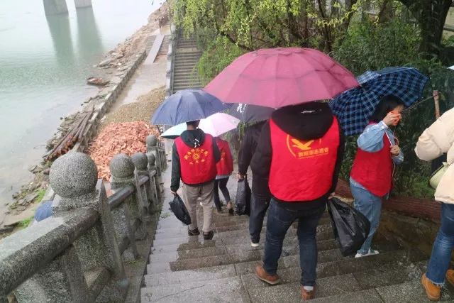 上午9点多,天还下着小雨,全体员工党员身穿红马甲,手持钳子、垃圾袋,两两一小组沿着江边的人行道拾捡江边的纸巾、果皮、烟头、食品袋等垃圾
