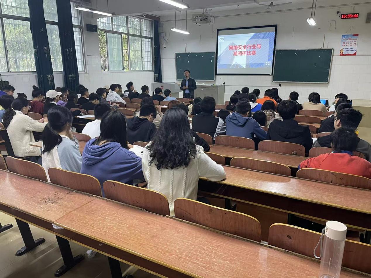 主要开展了以下三个方面的网络安全宣传教育活动:一是网络安全意识大讲堂和网络安全体验活动,邀请湖南省网安基地科技有限公司联合创始人熊勇总经理,重点针对软件工程专业和物联网工程专业的员工做了精彩的报告;二是在前期CTF竞赛中获胜的同学颁发了奖品;三是湖湘杯竞赛辅导,为准备参加第七届“湖湘杯”网络安全技能大赛的同学讲解赛制、组织分组和匹配队伍等。