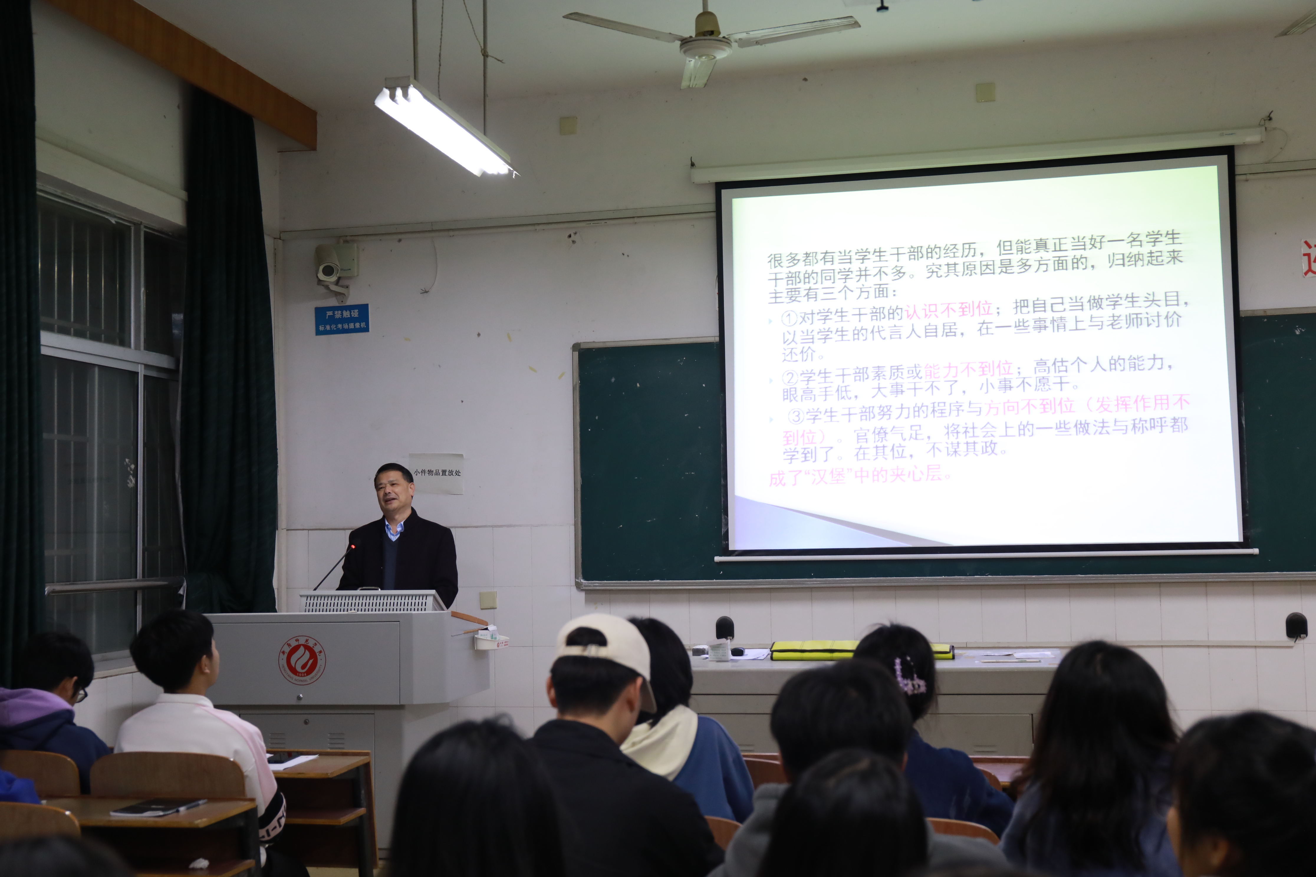 第二场讲座中,彭正副书记针对目前员工干部存在的问题,从三个方面总结原因:一是自我认知不到位,对自我身份的理解发生了偏差,二是能力不到位,没有正确处理好能力与工作的关系,三是方向不到位,错误的将社会上的不良的官僚作风自我代入,他指出,员工干部不仅要有优秀的学业成绩,还要加深对马克思主义的认识,强调员工干部一定要发挥引领作用,积极协调与同学与老师的关系,培养责任意识和集体意识。
