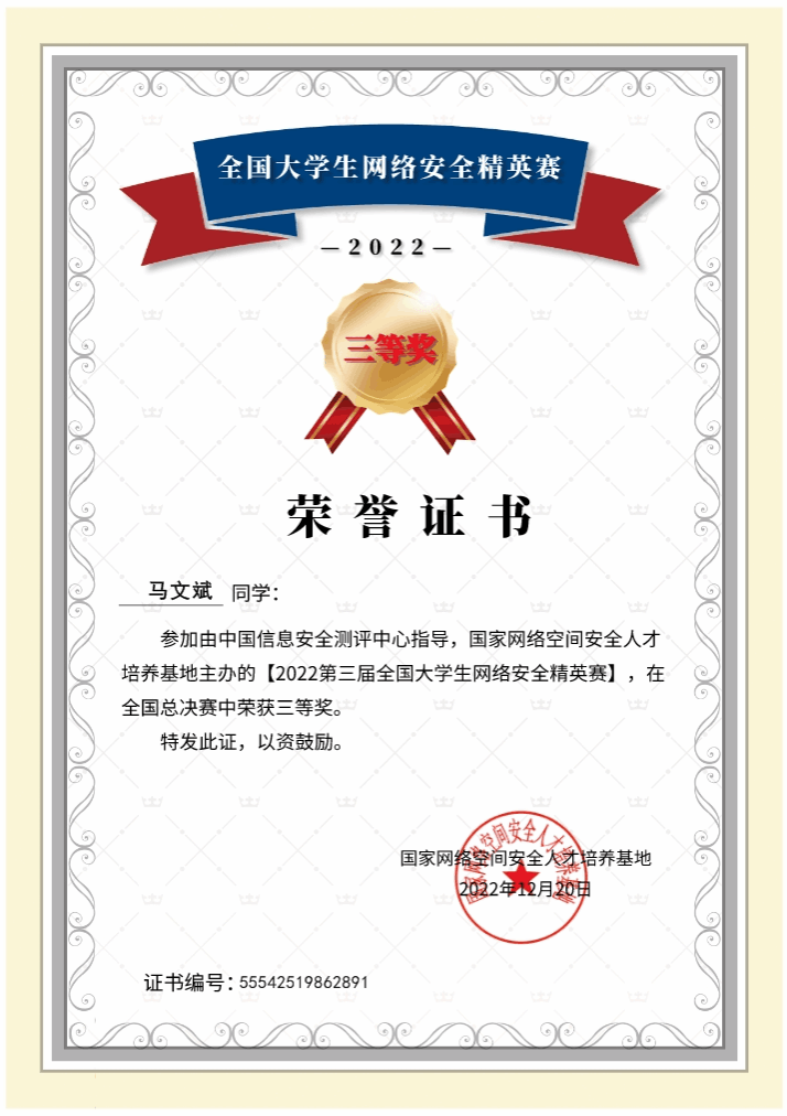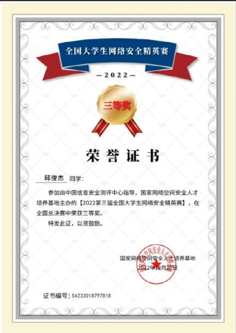 2022年12月18日,第三届全国老员工网络安全精英赛全国总决赛落下帷幕,mksport体育MK体育2022级计科学子邱俊杰、马文斌荣获国赛三等奖。