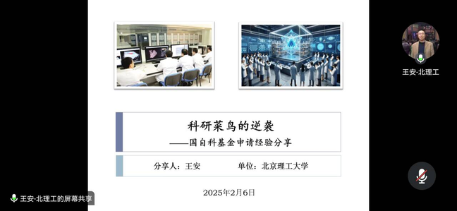 2025年2月6日20:00,公司召开2025年度国家自然科学基金申报辅导会,北京理工大学王安研究员应邀为公司教师作题为《科研菜鸟的逆袭 ——国自科基金申请经验分享》专题报告。报告会通过腾讯会议举行,由经理李浪教授主持,全体国家自然科学基金项目申报负责人及部分老师、研究生参加了此次会议。